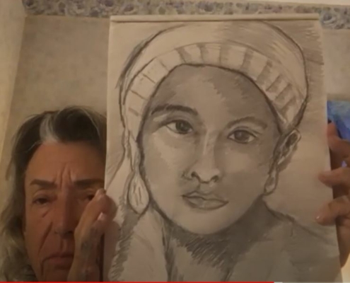 Gray Haired person facing away from the camera drawing on an easel